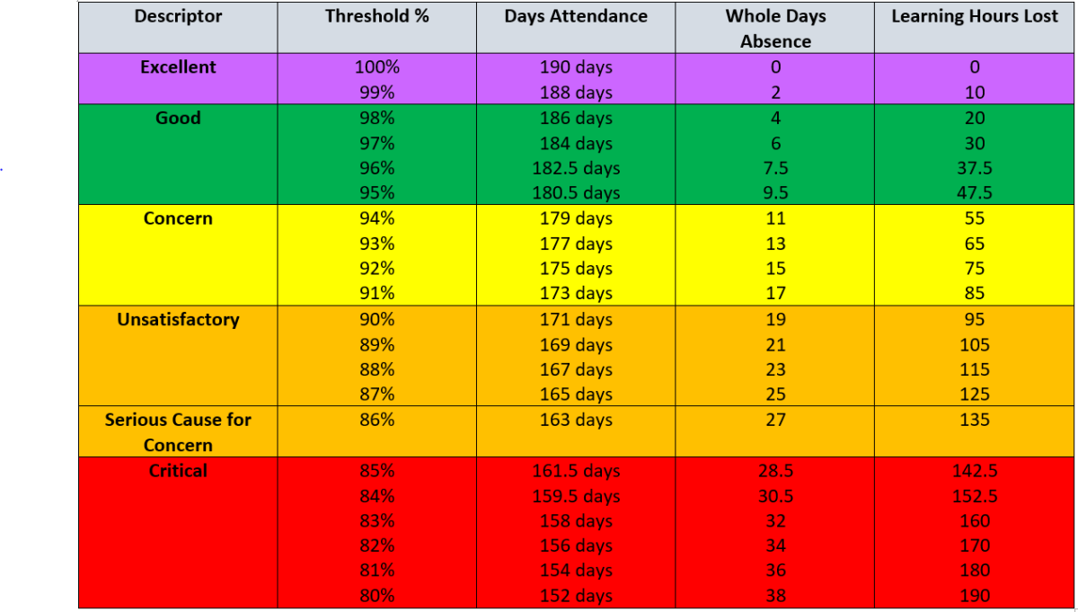 Table to detail the impact of absence in terms of missed learning.