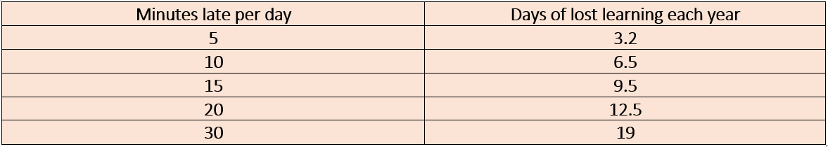 Table to detail the impact of lateness in terms of missed learning.
